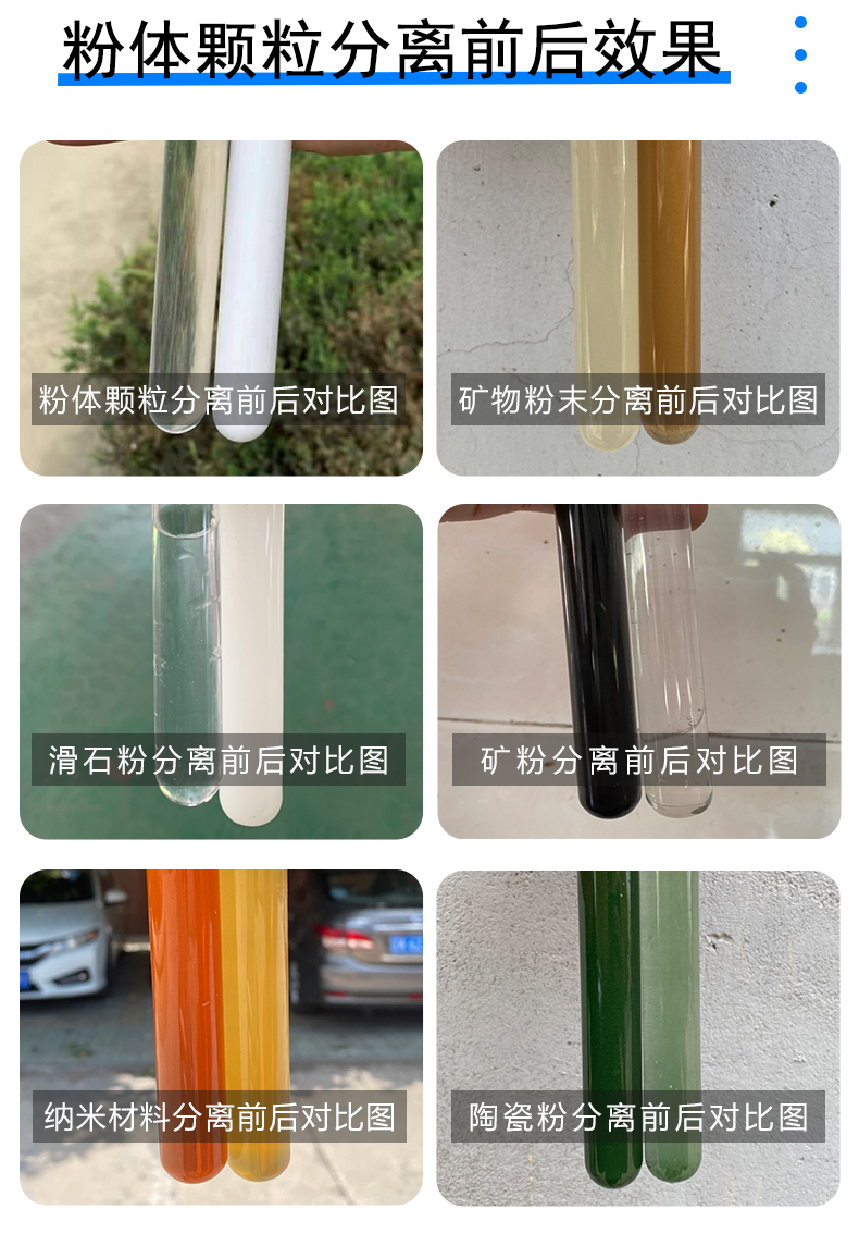 處理過的物料:納米材料、納米粉末、粉體顆粒、二氧化鈰、高嶺土、碳化硅、鎢粉、陶瓷粉、陶瓷漿料、鈦白粉、油墨、伊利石礦粉、******、銅粉、礦粉、鋅粉、金屬粉末、鋁粉、礦物粉末