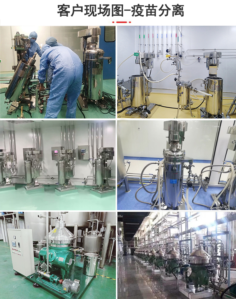 應(yīng)用設(shè)備:根據(jù)疫苗生產(chǎn)工藝的不同,物料的不同參數(shù),可適用的離心機(jī)有管式離心機(jī)、碟式離心機(jī),其選擇依據(jù)主要有處理量、含固量、分離效果等因素。