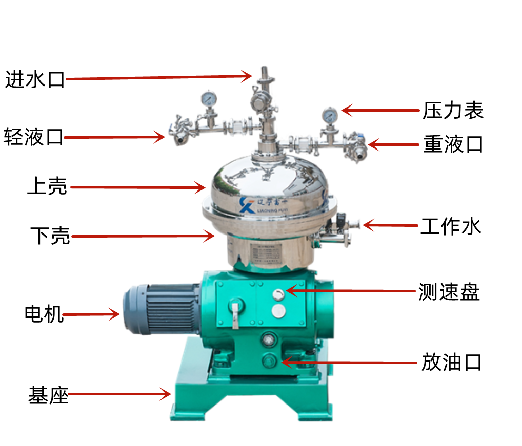 主要由進出口裝置、轉(zhuǎn)鼓、機蓋、立軸、橫軸等部件組成,轉(zhuǎn)鼓內(nèi)裝有一疊錐形碟片。物料由上部中心進料管流至轉(zhuǎn)鼓底部,經(jīng)碟片下座面的分流孔趨向轉(zhuǎn)鼓壁,在離心力作用下,比液體重的固相物沉向轉(zhuǎn)鼓內(nèi)壁形成沉渣,輕液沿錐形碟片外錐面向軸心流動至上部經(jīng)輕液向心泵排出,重液沿碟片內(nèi)錐面趨向鼓壁,然后向上流經(jīng)重液向心泵排出,從而完成三相分離。
