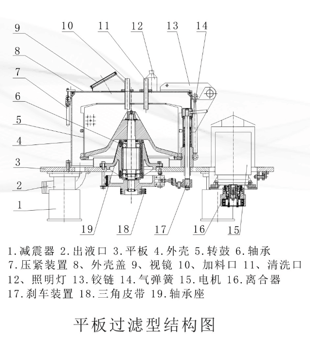 二、工作原理:待分離的物料經(jīng)進料管進入高速旋轉(zhuǎn)的離心機轉(zhuǎn)鼓內(nèi),在離心力作用下,液體穿過濾布及轉(zhuǎn)鼓上的濾孔,被甩到機殼內(nèi)壁經(jīng)過出液管排出,固相顆粒則被截留在轉(zhuǎn)鼓內(nèi),從而實現(xiàn)固液分離。